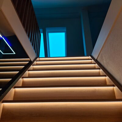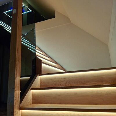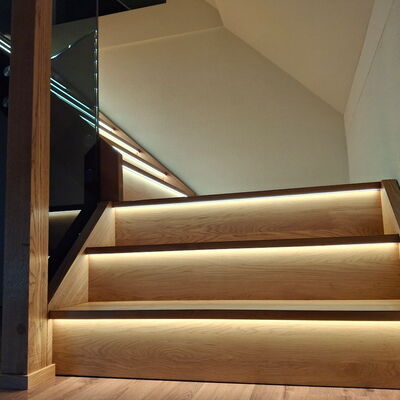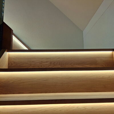 - Treppe aus Eiche Massivholz produziert, LED-Streifen in die Treppentritte unten eingefräst und unsichtbar verkabelt