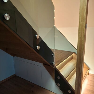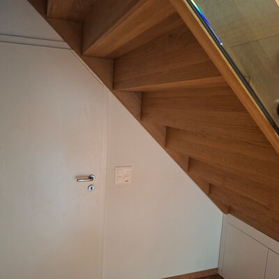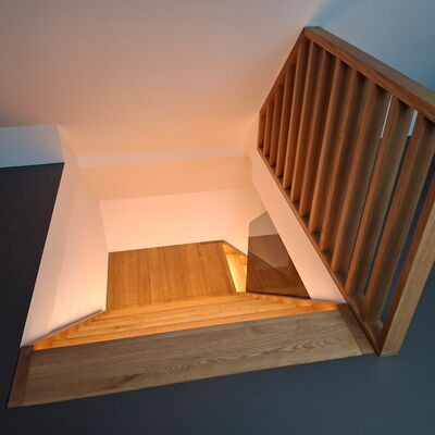 - Treppe aus Eiche Massivholz produziert, LED-Streifen in die Treppentritte unten eingefräst und unsichtbar verkabelt